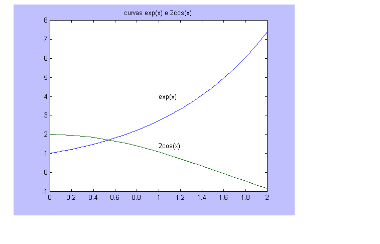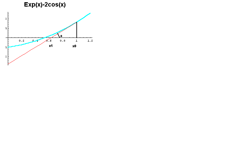 Vamos admitir que se pretenda calcular a raiz de ex - 2 cos(x) = 0. Pelo gráfico vemos que a raiz está próxima a 0,5. Vamos tomar como primeira aproximação um valor mal escolhido, qual seja x0 = 1,0 . Calculamos f(x0 ) = f(1) = 1,6377 .